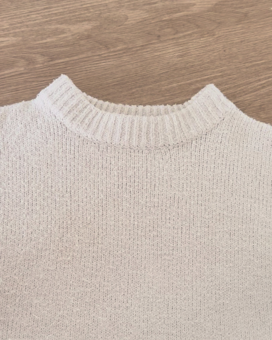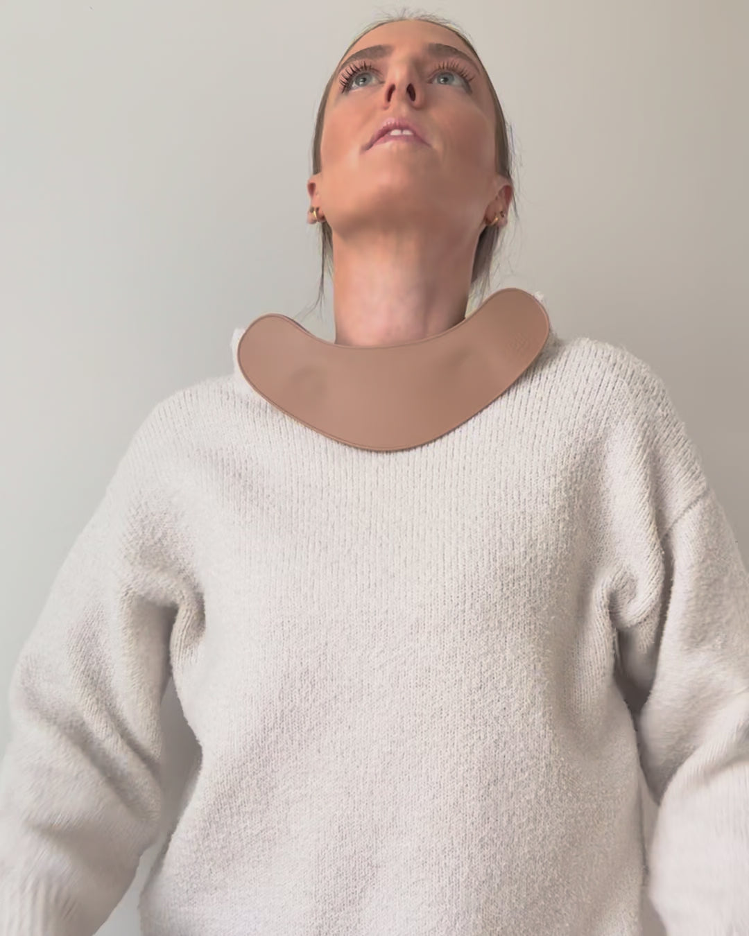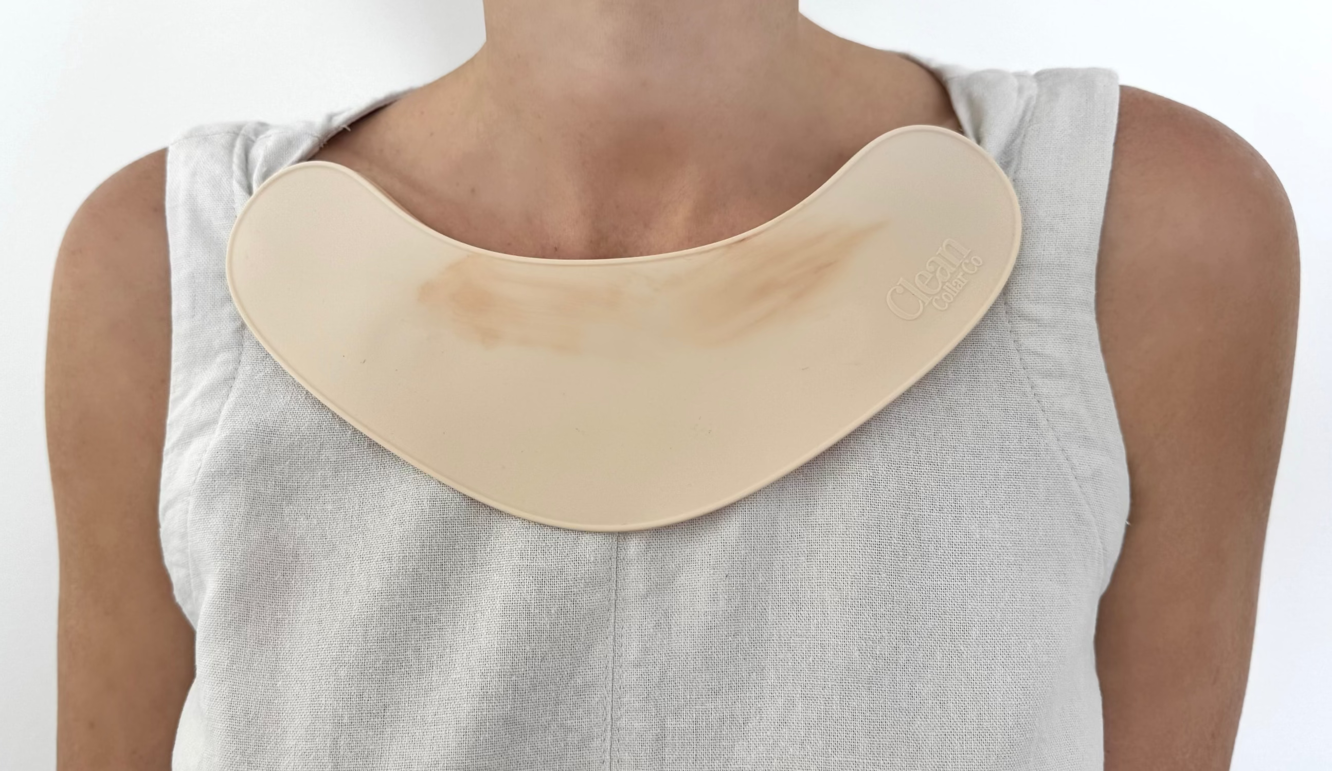 Place the clothing over your head while pushing your chin down onto the Clean Collar Co.